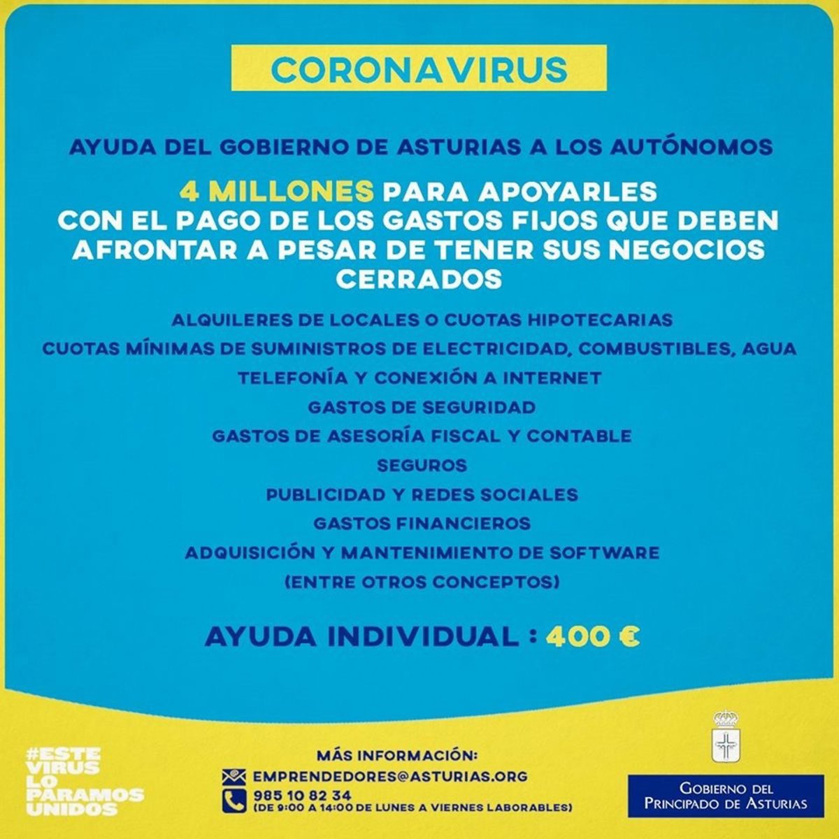 "Somos conscientes de las dificultades y perjuicio económico que está pasando un colectivo como el de los autónomos que tiene enorme importancia para el tejido económico del principado", ha indicado Fernández, que ha recordado que se trata de una subvención directa e individualizada de 400 euros que beneficiarán unas 10.000 personas. La ayuda va destina a hacer frente a gastos fijos.