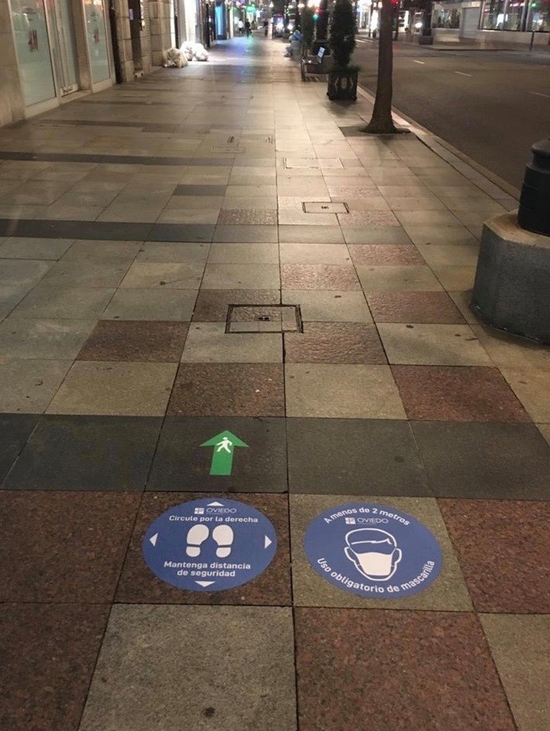 El ayuntamiento de Oviedo ha colocado pegatinas en las aceras de las calles Uría, Pelayo y Palacio Valdés informando a los peatones sobre cómo deben circular y recordándoles la obligación de llevar mascarilla.