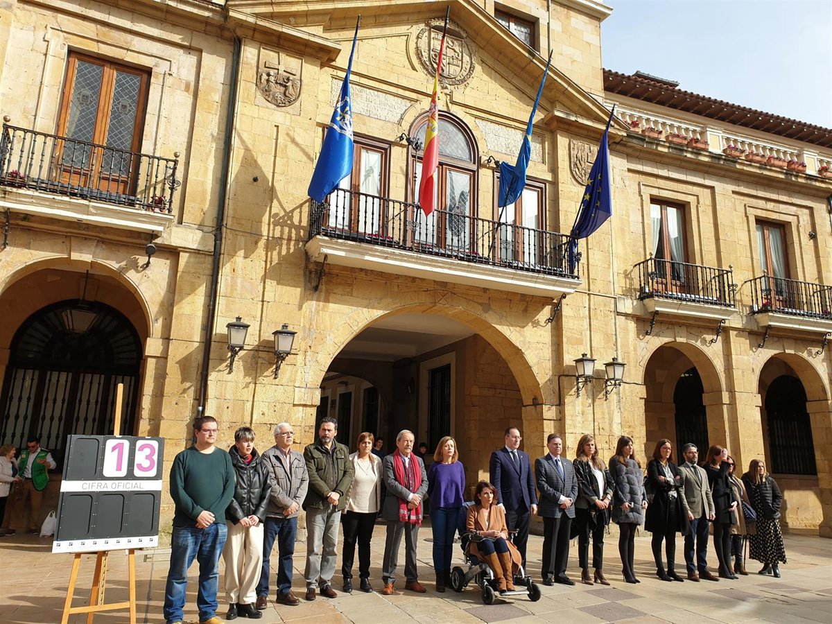 Miembros de la corporación del Ayuntamiento de Oviedo han guardado este viernes un minuto de silencio en la Plaza de la Constitución por las mujeres asesinadas víctimas de la violencia de género.