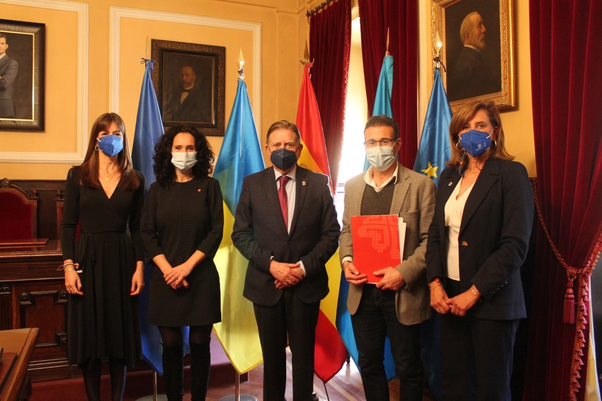 El Alcalde de Oviedo, Alfredo Canteli, y las concejalas de Políticas Sociales del Ayuntamiento de Oviedo, Concepción Méndez y Leticia González, han mantenido este miércoles una reunión con Aurora García García, Directora de Cáritas Diocesana, y Ramón Méndez-Navia, secretario General de Cáritas Diocesana.