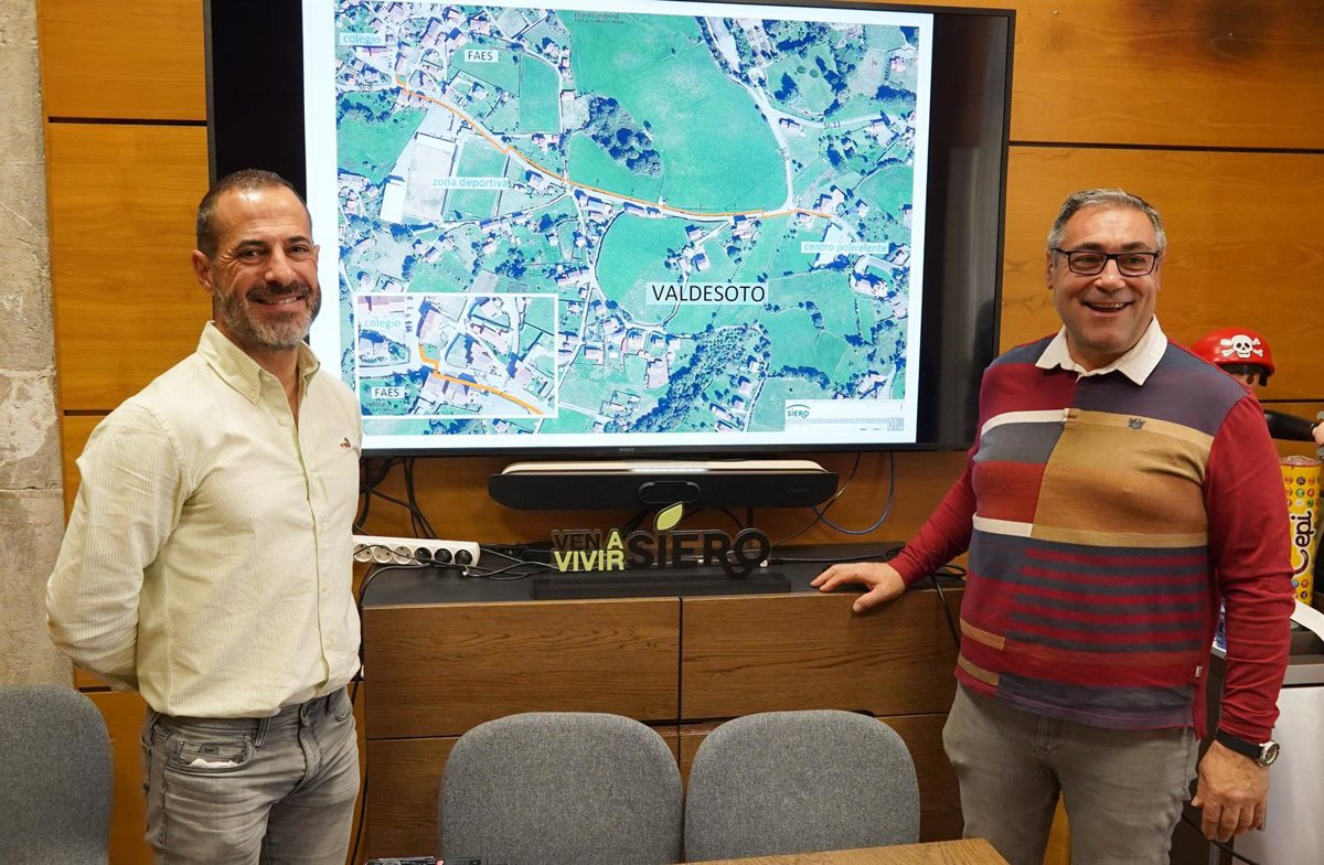 El alcalde de Siero, Ángel García, y el concejal de Abastecimiento de Agua y Saneamiento, Parque Móvil, Asociaciones de Vecinos y Centros Socioculturales en el Ámbito Rural, Manuel Pergentino Martínez, han presentado este jueves el proyecto de construcción de acera en la carretera SI-8 en Valdesoto.