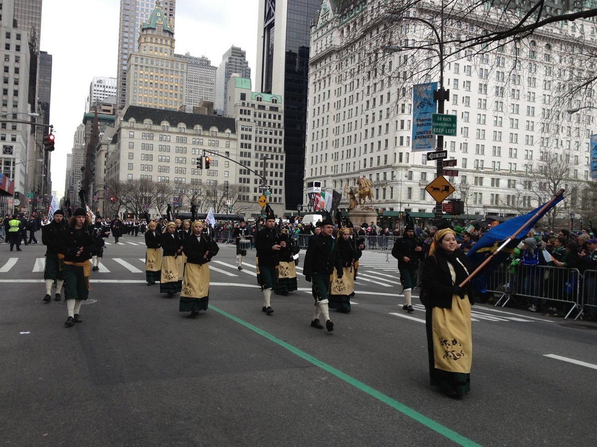 La banda de gaitas naviega La Reina del Truébano ha participado este domingo un año más en el desfile del día de San Patricio (Saint Patrick, patrón de Irlanda) en Nueva York, esta vez sin ningún apoyo del Gobierno autonómico, ni tampoco de ninguna empresa de la comunidad.