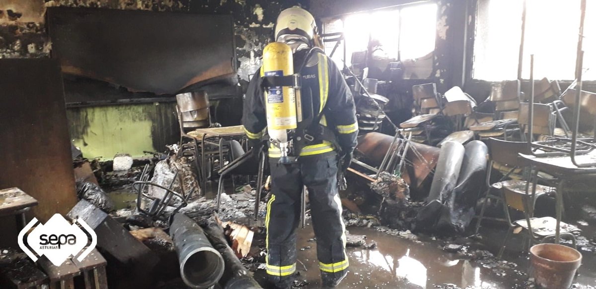 El Centro de Coordinación de Emergencias del 112 Asturias ha recibido el aviso a las 09.22 horas. En la llamada señalaban que estaba quemando una estancia que usaban como almacén en el colegio. Los alumnos habían sido desalojados al patio.