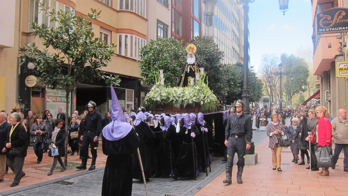 La procesión de La Soledad ha recorrido esta mañana las calles de Oviedo, acompañada, como siempre, por varios integrantes del cuerpo de Bomberos de la Ciudad, y portada a hombros por un grupo de 32 costaleros.