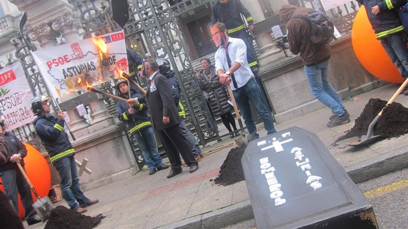 Bomberos de Asturias han celebrado este jueves un simbólico entierro de su entidad ante la Junta General, en una nueva de sus ya habituales acciones protesta por sus condiciones de trabajo, celebradas cada jueves, coincidiendo con el pleno ordinario de la cámara.