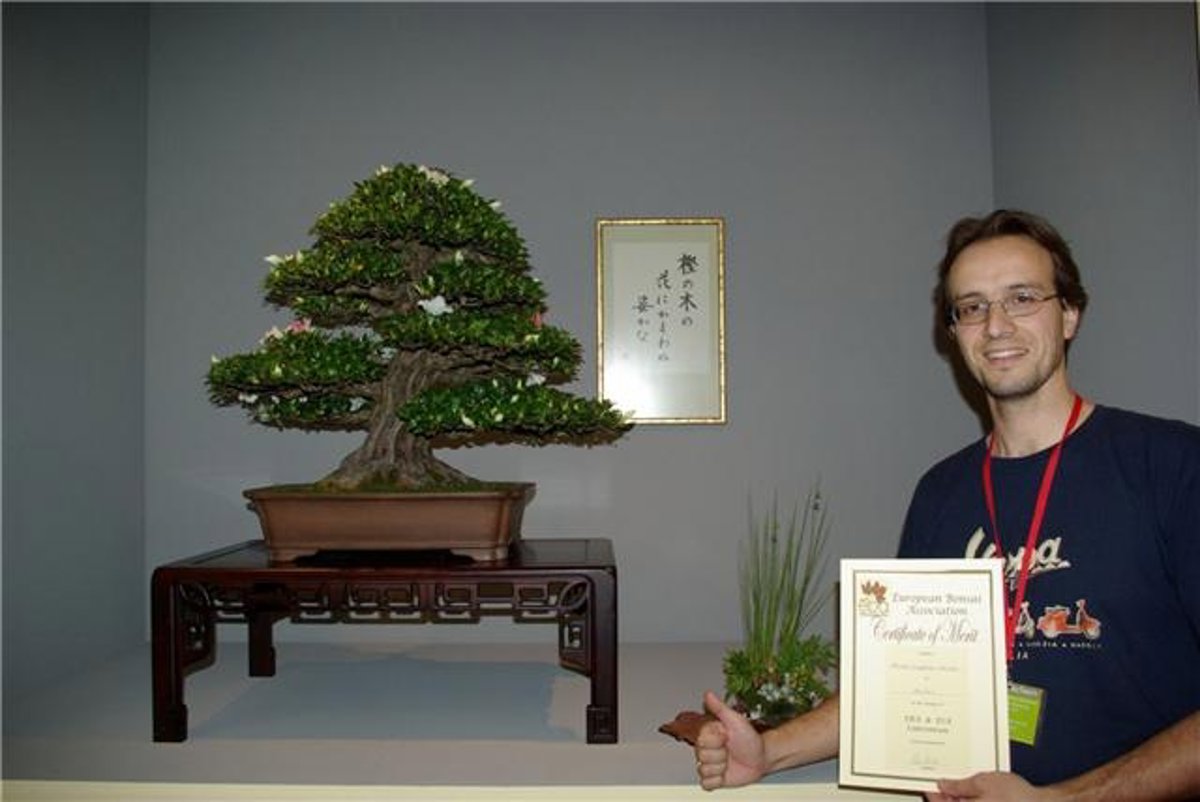 Se trata de un ejemplar de Azalea importada hace algunos años de Japon. En la propia exposición de Oviedo obtuvo el reconocimiento del publico asistente, ya que fue el árbol mas votado por quienes asistieron al evento.