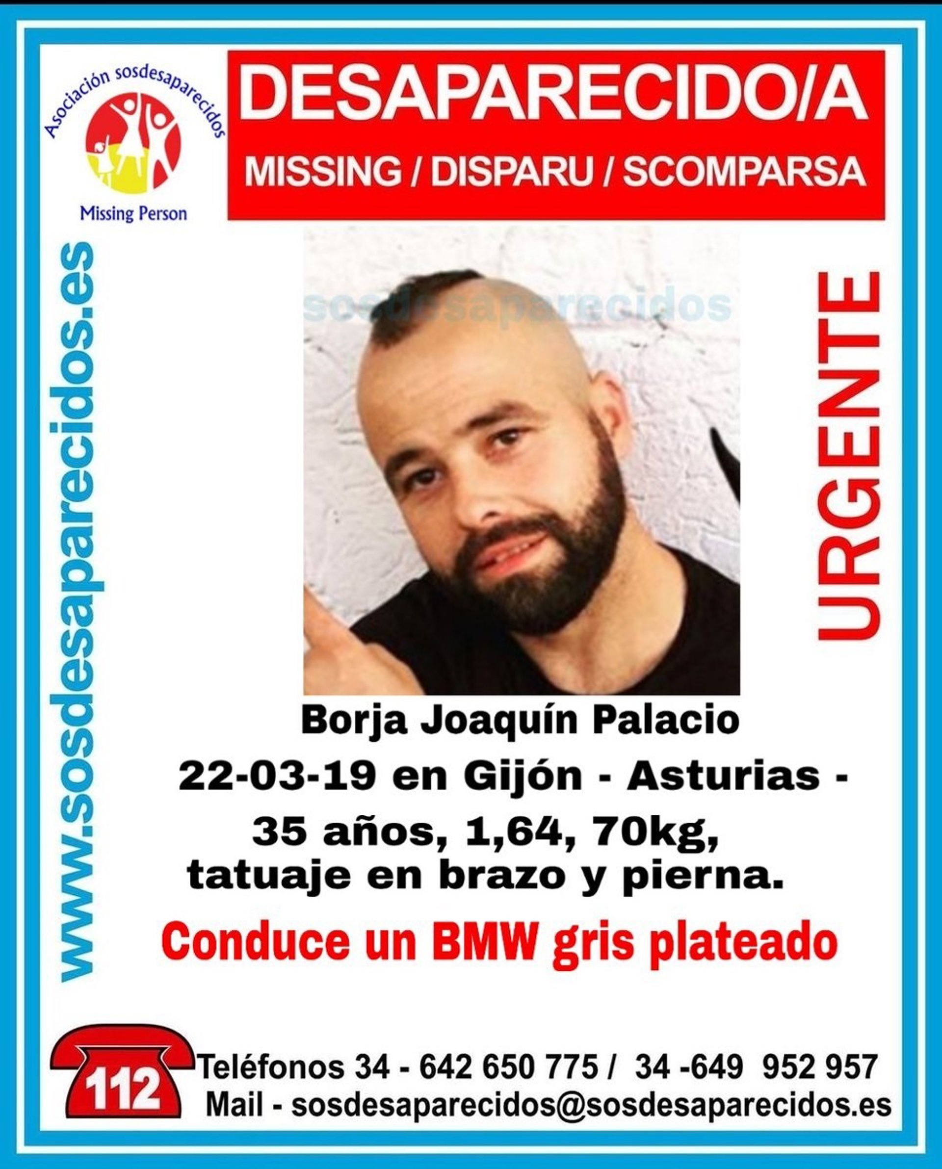 Borja Joaquín Palacio mide 1,64 y pesa 70 kilos. Lleva un tatuaje en el brazo y otro en la pierna, según se describe en el cartel difundido por su desaparición. Se indica además que el hombre conducía un BMW gris plateado la última vez que se le vio.