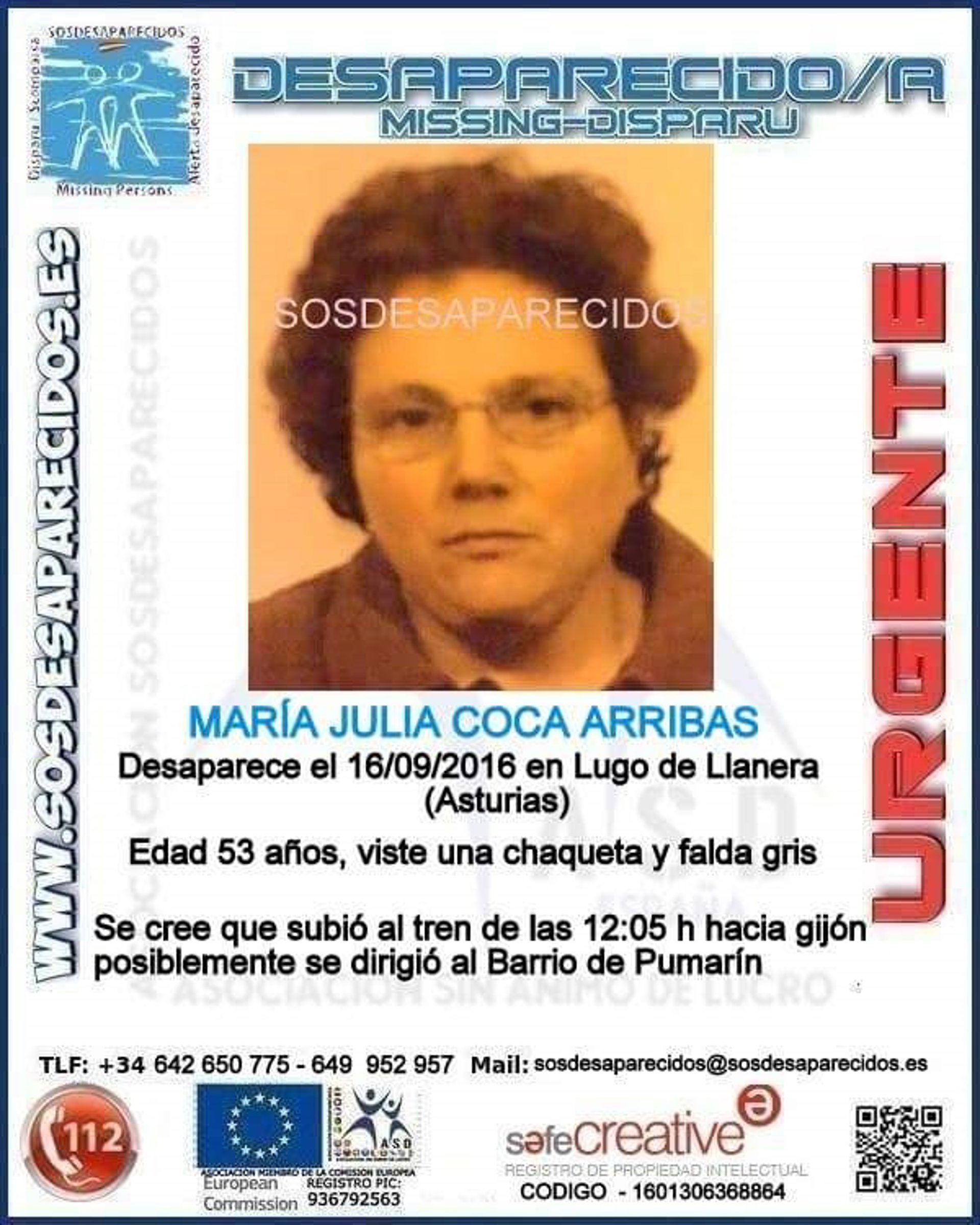 Se cree que subió al tren en Lugo de Llanera con destino a Gijón, y que fue vista por última vez en el barrio de Pumarín de esta última localidad. Viste chaqueta y falda gris.
