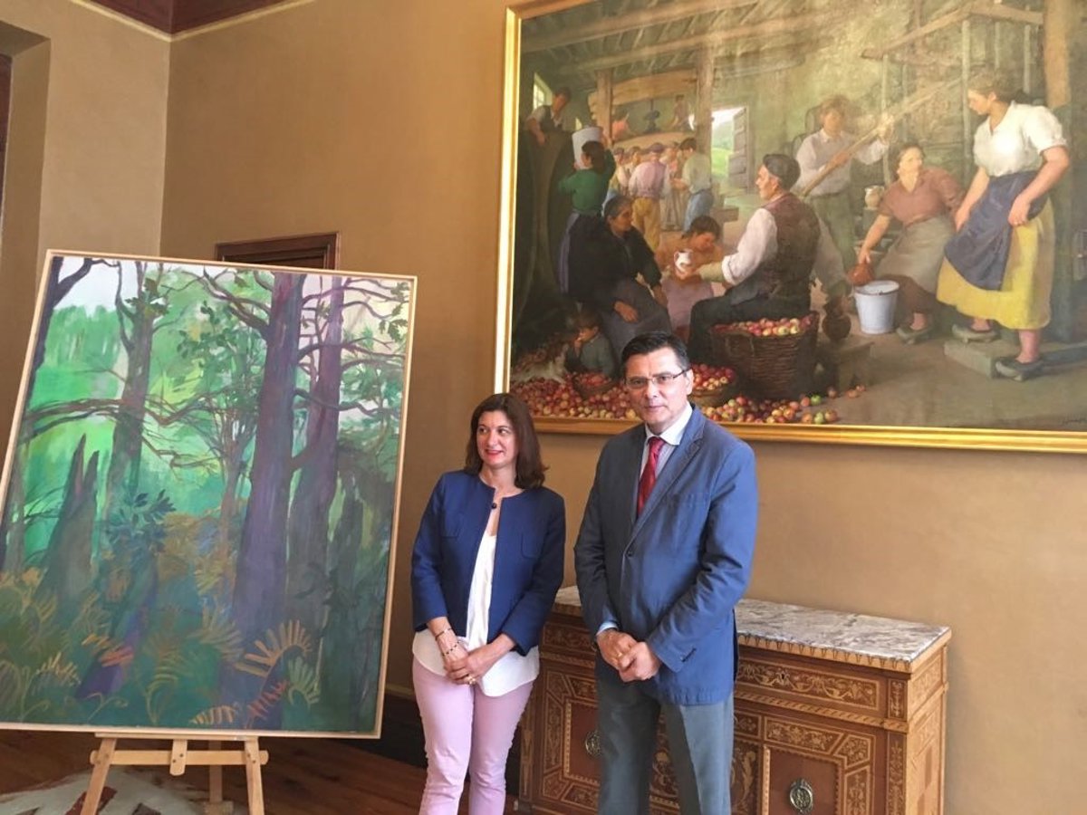 La artista gijonesa Covadonga Valdés Moré ha formalizado este miércoles la donación a la Junta General del Principado de su óleo sobre lienzo 'Búsqueda', de 2015. Une así su obra con la de su abuelo Mariano Moré, con quien comparte su "amor por la naturaleza asturiana".