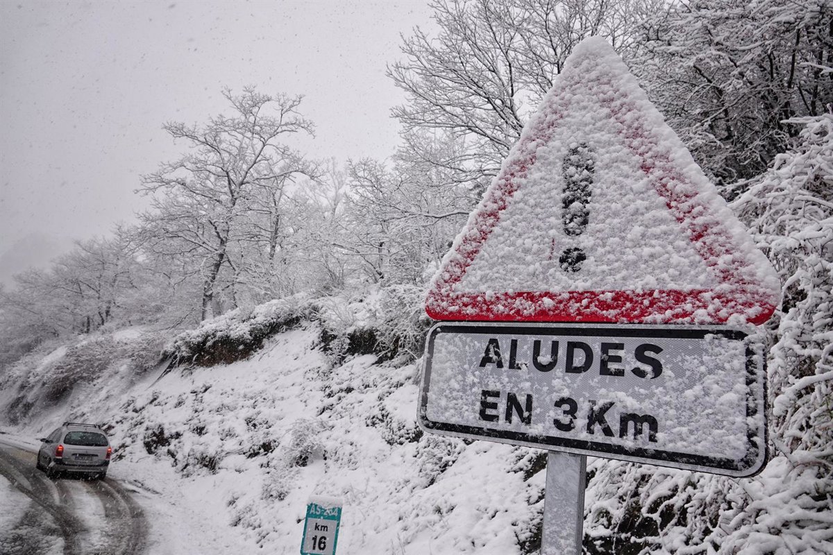 Una señal de tráfico cubierta de nieve en la carretera AS-264 de acceso a Sotres (Cabrales), a 17 de enero de 2023, en Cabrales, Asturias (España). Los vehículos pesados tienen restringido el paso en el Alto de Estazadas (Cabrales) como consecuencia de - Xuan Cueto - Europa Press