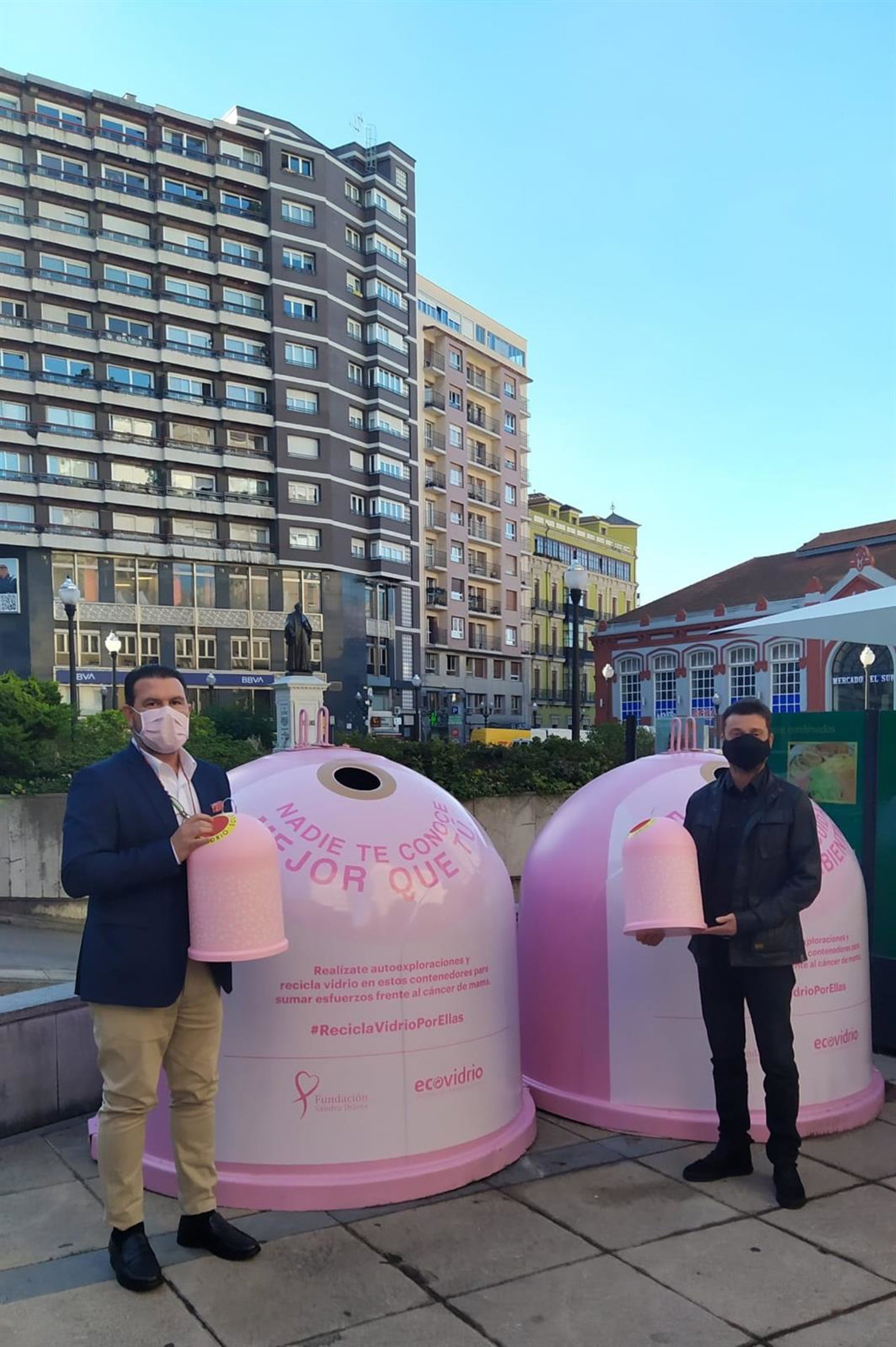 Gijón participa en una campaña puesta en marcha por Ecovidrio, por sexto año consecutivo, movilizar a los ciudadanos a reciclar envases de vidrio para cuidar del medioambiente y contribuir así con una causa solidaria: la prevención del cáncer de mama.