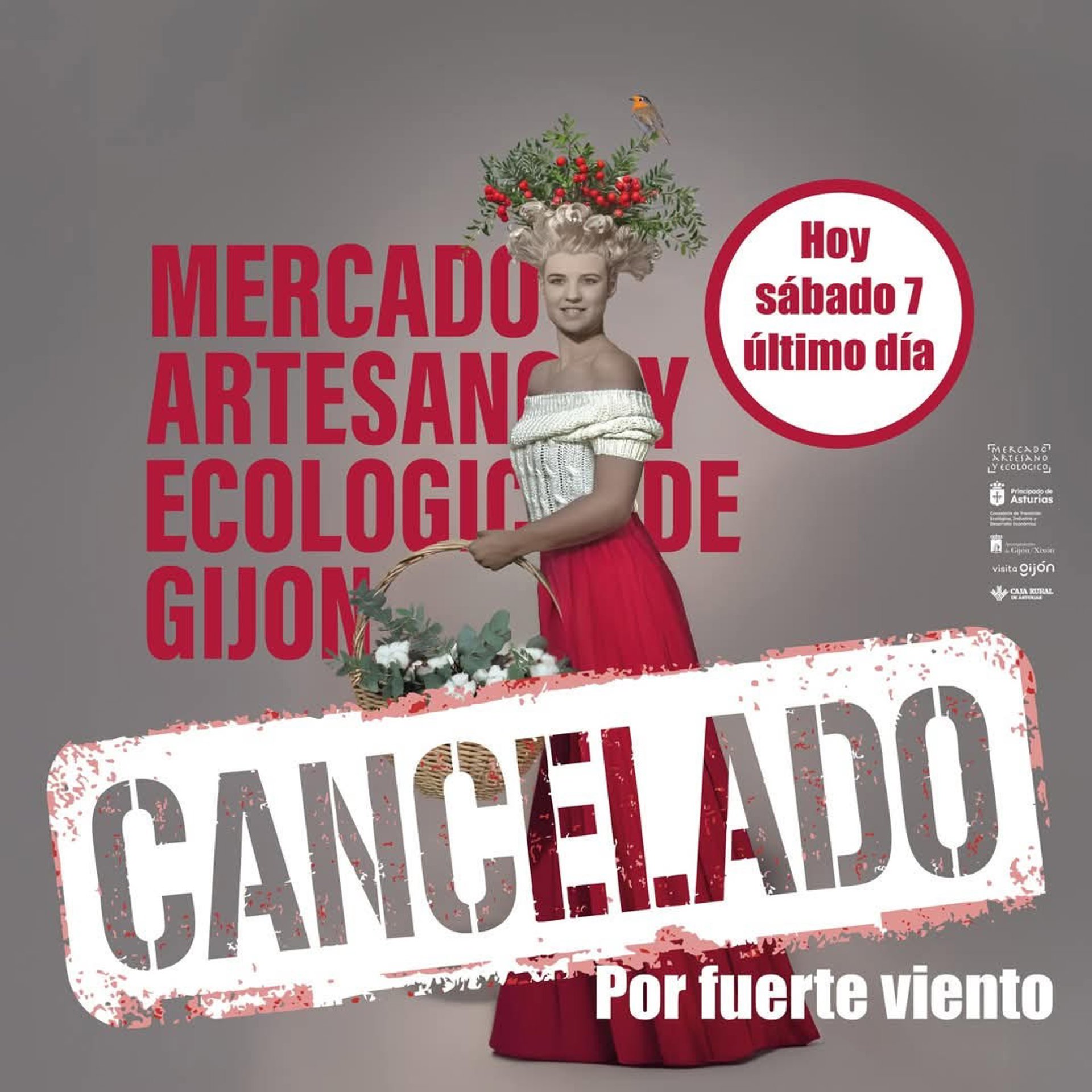 Cartel anunciando la cancelación del Mercado Artesano y Ecológico de Gijón ante la previsión de fuertes vientos - Mercado Artesano y Ecológico de Gijón