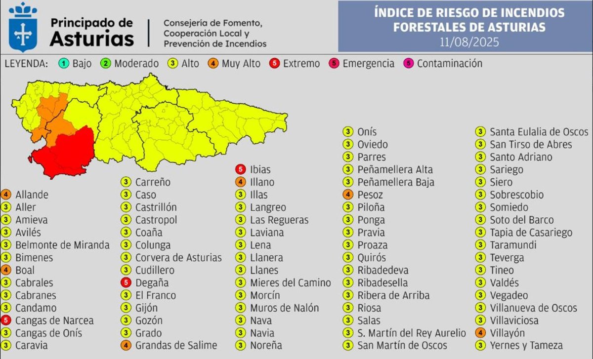 Además de esos tres concejos en riesgo extremos otros seis municipios estarán en riego 'muy alto'. Serán los municipios de Allande, Boal, Grandas de Salime, Illano, Pesoz y Villayón.