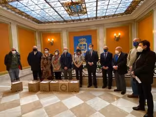 El Alcalde de Oviedo, Alfredo Canteli (PP), ha hecho entrega este martes en el Ayuntamiento de las cestas de Navidad de la Hermandad de Donantes de sangre de Asturias a donantes que participaron en el Maratón de donaciones de finales de noviembre.