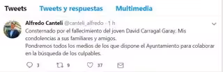 Canteli en su cuenta de twitter ha escrito este lunes: "Consternado por el fallecimiento del joven David Carragal Garay. Mis condolencias a sus familiares y amigos. Pondremos todos los medios de los que dispone el Ayuntamiento para colaborar en la búsqueda de los culpables".
