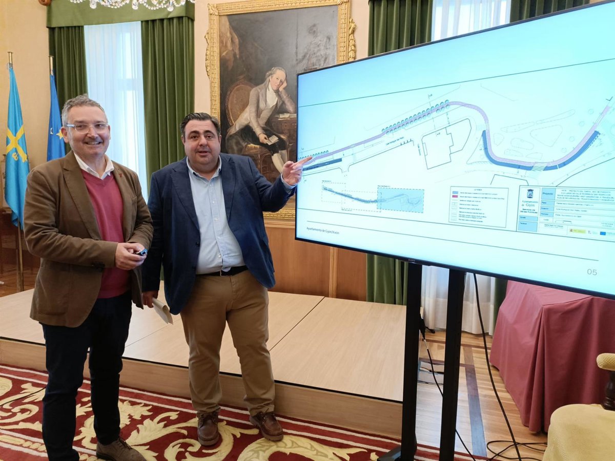 El concejal de Infraestructuras Urbanas y Rurales de Gijón, Gilberto Villoria (izda), y el concejal de Tráfico, Movilidad y Transporte Público, Pelayo Barcia, presentan el proyecto del carril - bici de Poniente, en el Consistorio gijonés. - EUROPA PRESS
