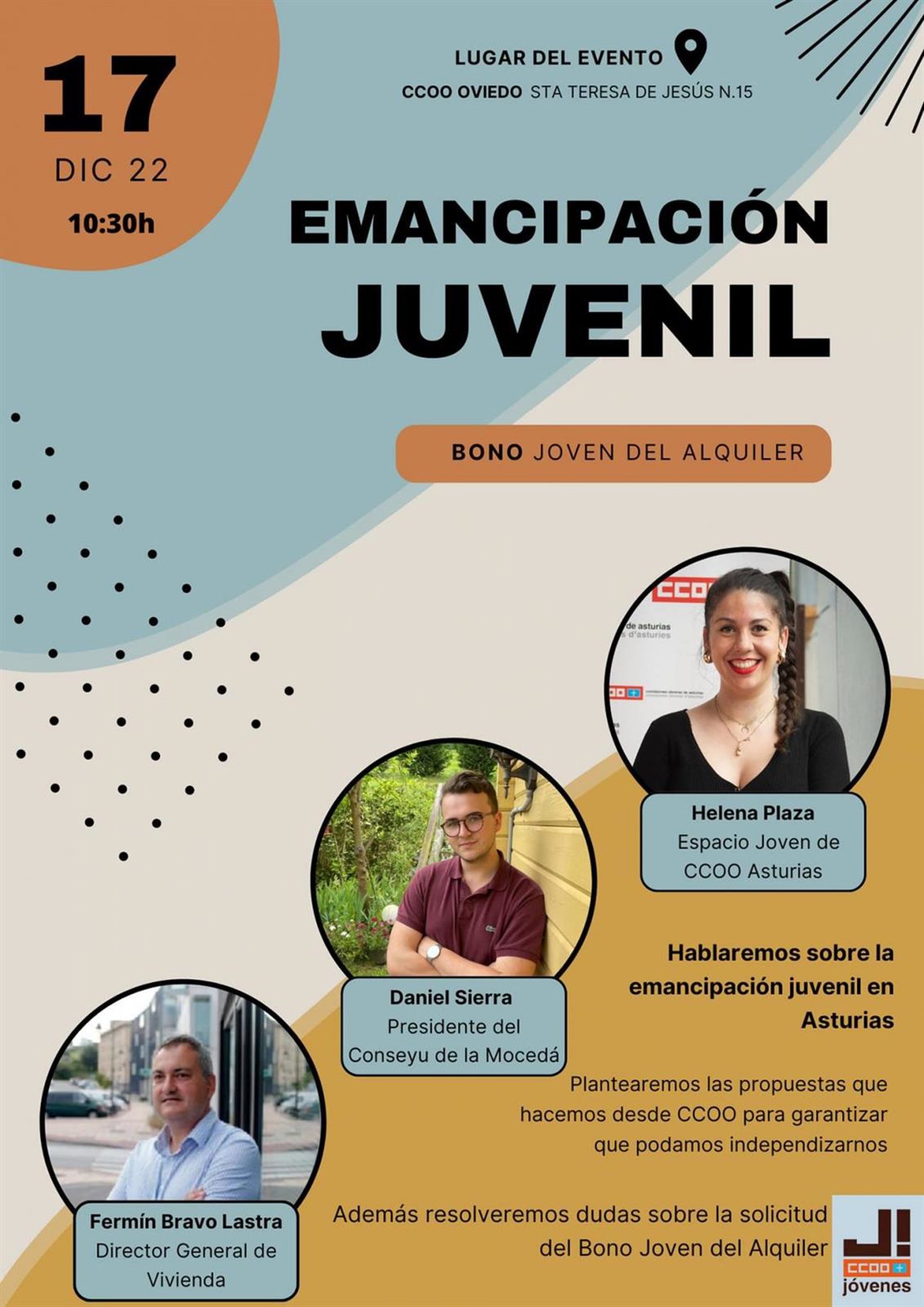 Comisiones Obreras de Asturias celebra este sábado una asamblea sobre emancipación juvenil y bono joven de alquiler, centrada en aportar respuestas a las dudas que los asistentes puedan tener acerca de la solicitud del bono joven o las problemáticas existentes a la hora de acceder a una vivienda.