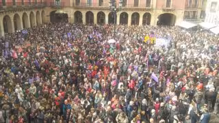 La Plaza Mayor ha protagonizado este jueves un día histórico en la lucha por la igualdad de mujeres y hombres, con centenares de personas que han querido marcar un punto de inflexión y un antes y un después en la defensa de los derechos de la población femenina, y con vítores en contra de la violencia de género.