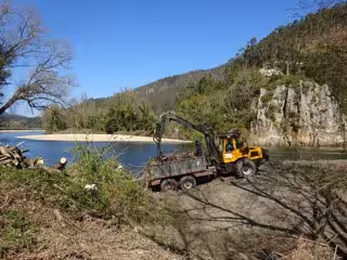 La Confederación Hidrográfica del Cantábrico (CHC) ha comenzado los trabajos de retirada de árboles, troncos y ramajes en puentes y obras de paso en el cauce del Bajo Nalón, a su paso por el municipio de Pravia, concretamente en la Vega de Forcinas.