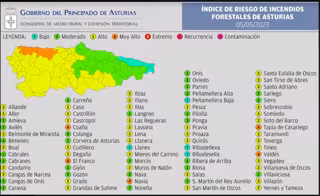Cinco municipios del Principado tendrán este viernes 5 de mayo riesgo 'muy alto' de sufrir incendios forestales, según información de la Dirección General de Infraestructuras Rurales y Montes calculada en base a las previsiones meteorológicas de AEMET disponibles y de los datos de recurrencia temporal y espacial de incendios forestales.