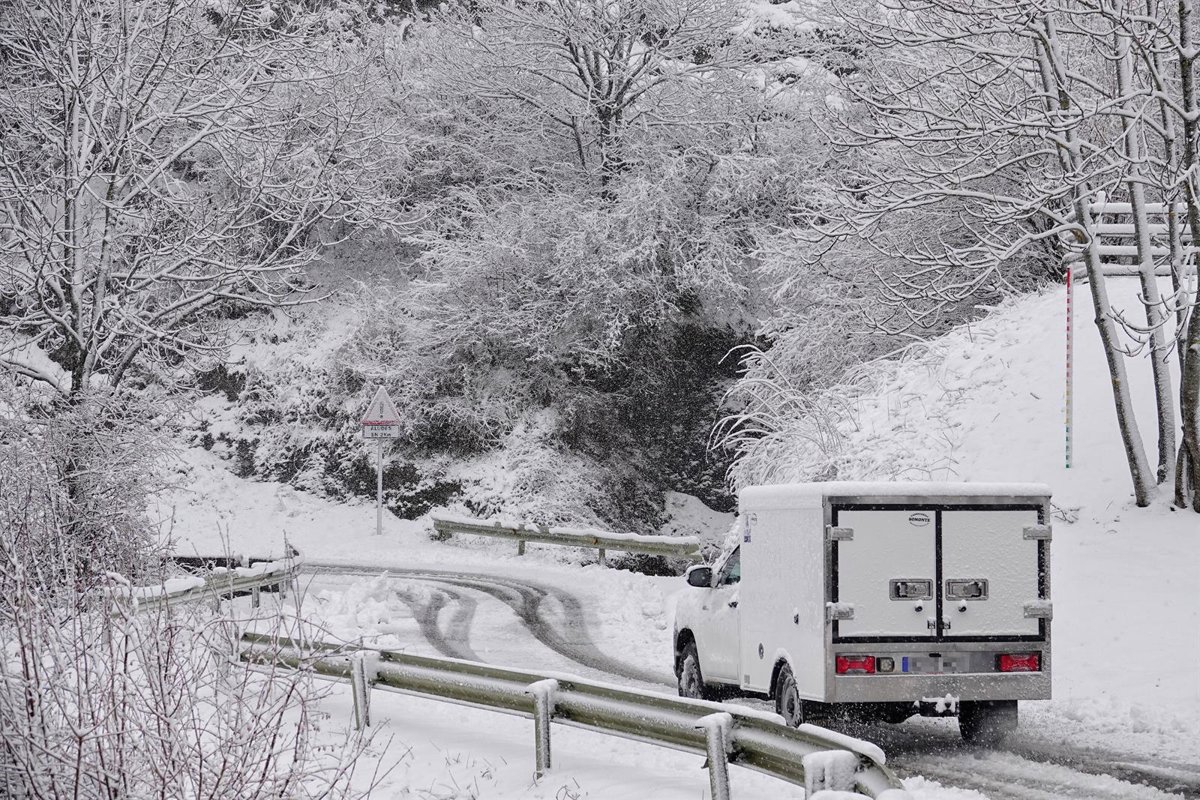 Un vehículo circula por la carretera AS-264 de acceso a Sotres (Cabrales), a 17 de enero de 2023, en Cabrales, Asturias (España). Los vehículos pesados tienen restringido el paso en el Alto de Estazadas (Cabrales) como consecuencia de la nieve. El tempo - Xuan Cueto - Europa Press