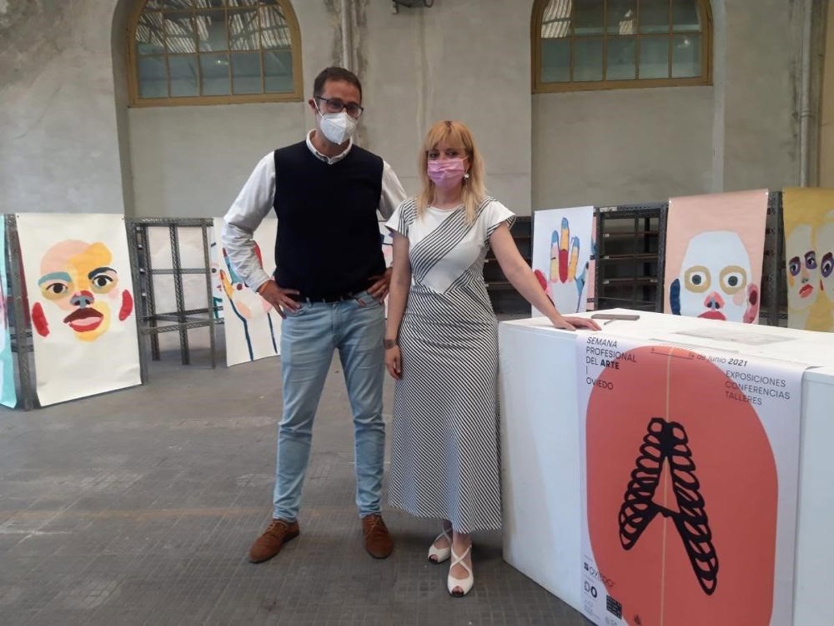 El concejal de Cultura, José Luis Costillas, acompañado por la artista Marta Fermín, gestora de la I Semana Profesional de las Artes de Oviedo y presidenta de las Galerías de arte de Asturias. - AYUNTAMIENTO DE OVIEDO