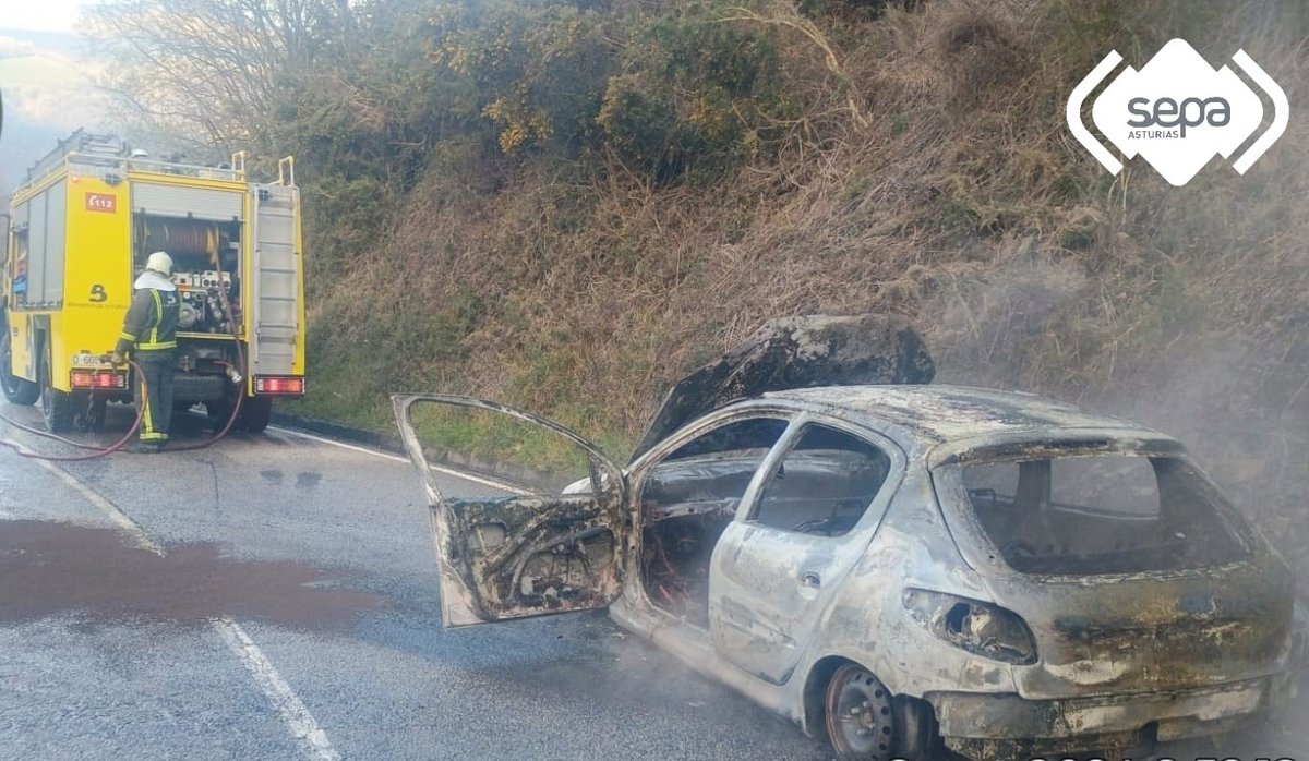Efectivos de Bomberos de Asturias con base en Grado sofocaron el incendio de un coche en la AS-310, punto kilométrico 14,950, en Boinás, Belmonte de Miranda, según informa el 112-Asturias en su cuenta de la red X.
