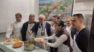 Sor Fernanda ha participado este martes en la preparación del tradicional Menú del Desarme, que es protagonista estos días en Oviedo. También han estado presentes el jefe de cocina de la Cocina Económica, Florentino Menéndez, el presidente de la institución, José García-Inés, y el presidente de la patronal hostelera Otea, José Luis Álvarez Almeida.