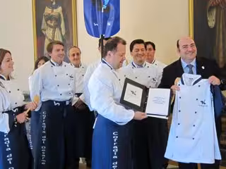 Durante el acto, el presidente de la asociación, Miguel Ángel de Dios, le ha entregado al regidor ovetense la chaquetilla, el delantal y la cuchara de madera típicos de la asociación, que, desde este viernes al domingo, ofrecerá en los restaurantes de la ciudad el menú del Desarme, compuesto por garbanzos con bacalao y espinacas, callos a la asturiana y arroz con leche.