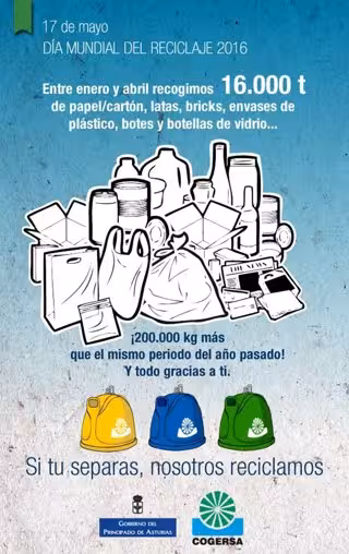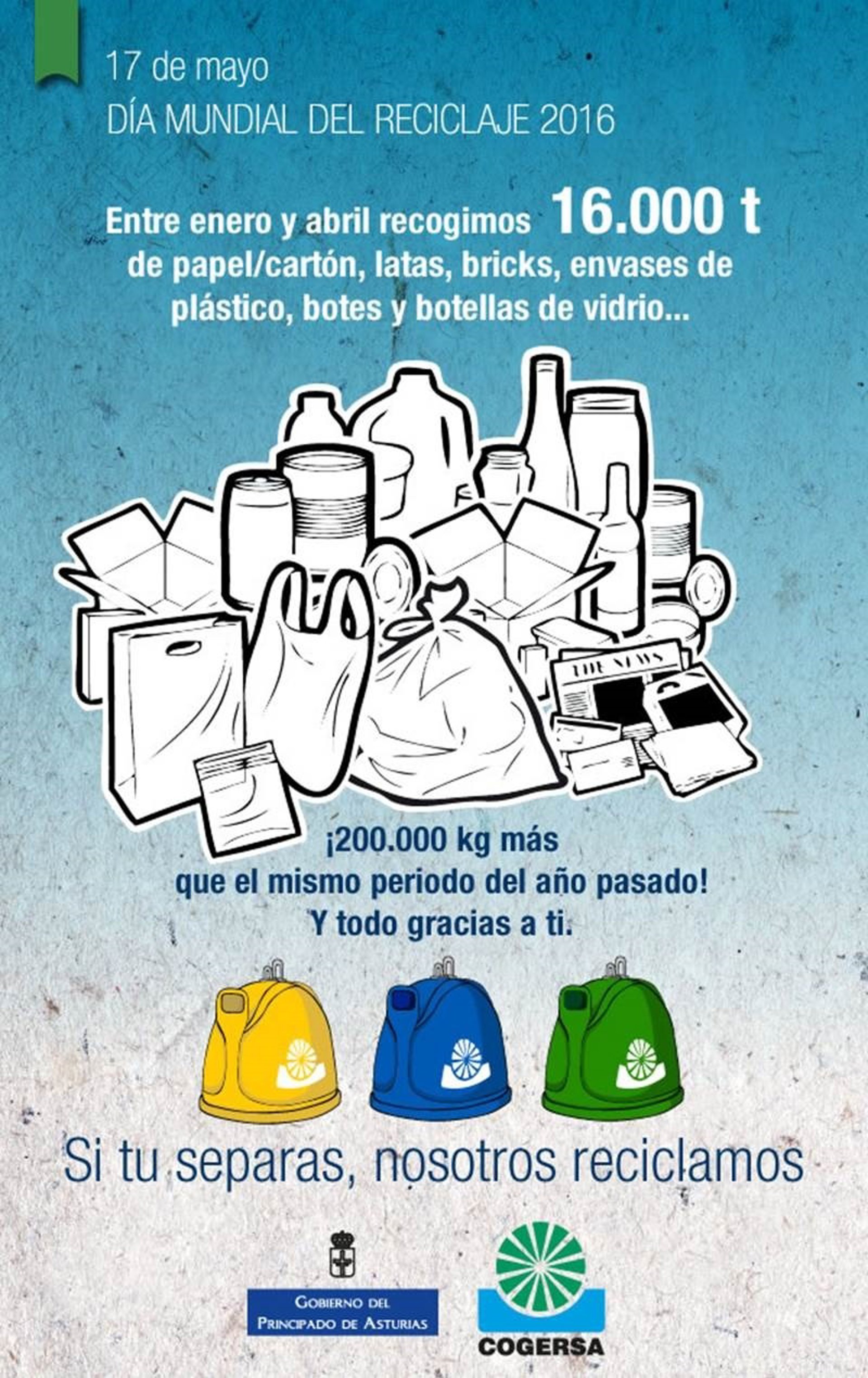 Este martes 17 de mayo se celebra el Día Mundial del Reciclaje, y desde Cogersa aprovechan la fecha para destacar la participación de los asturianos en la separación de los residuos, ya que la misma sigue aumentando de manera progresiva en Asturias hasta alcanzar las 16.000 toneladas en el primer cuatrimestre.