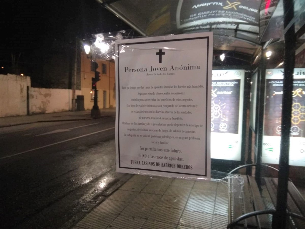Para ello, han colocado carteles simulando esquelas anónimas en mobiliario urbano, como marquesinas de autobús, en los que puede leerse: "Persona joven anónima. Hace ya tiempo que las casas de apuestas inundan los barrios más humildes. Seguimos viendo cómo cientos de personas contribuyen a acrecentar los beneficios de estos negocios. Este tipo de establecimientos están escapando del centro del centro urbano y se están abriendo en los barrios obreros de las ciudades: de nuestra necesidad sacan su beneficio. El futuro de los barrios y de la juventud no puede depender de este tipo de negocios, de casinos, de casas de juego, de salones de apuestas. La ludopatía no es solo un problema psicológico, es un grave problema social y familiar. No permitamos este futuro. Di no a las casas de apuestas. Fuera casinos de barrios obreros".