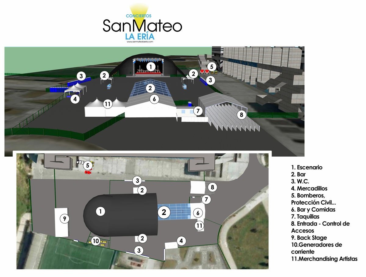 Este lunes, 2 de septiembre, ha comenzado el montaje de las carpas y del resto de instalaciones que conformarán el recinto de conciertos de La Ería durante las fiestas de San Mateo. Tendrá capacidad para acoger a 9.000 espectadores, de los cuales 8.000 se estima que podrán estar a cubierto, bajo la gran carpa que acogerá el escenario, en la explanada del campo de fútbol Carlos Tartiere.