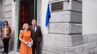 El alcalde de Oviedo, Alfredo Canteli, y la directora de la Escuela Municipal de Música, Gemma Losa, descubren la placa en recuerdo de la compositora ovetense María Teresa Prieto. - EUROPA PRESS