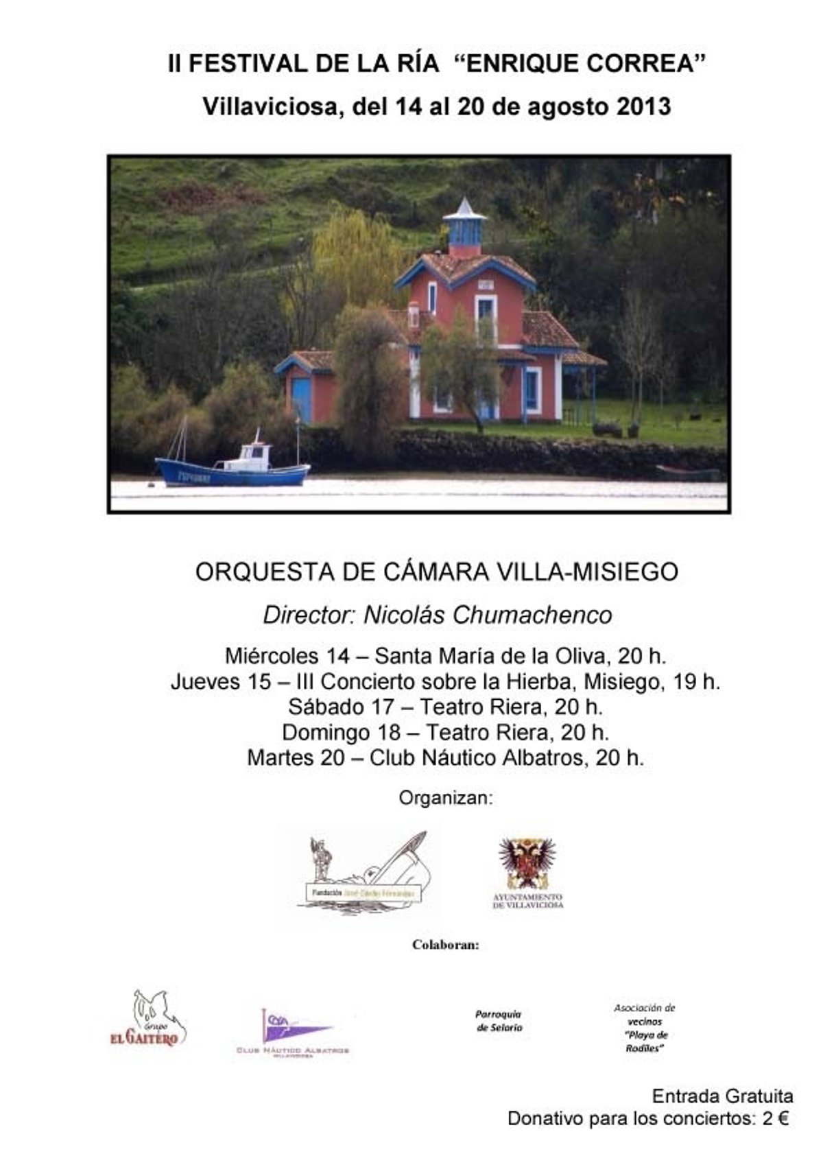 El concejo de Villaviciosa celebra desde este miércoles hasta el 20 de agosto la segunda edición del Festival de la Ría 'Enrique Correa'. Esta cita abarcará cinco conciertos gratuitos de música clásica a cargo de la Orquesta de Cámara Villa-Misiego, dirigida por Nicolás Chumachenco y tendrán lugar en varios emplazamientos del Concejo.