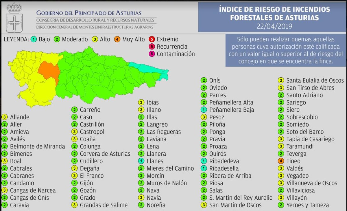 El municipio de Tineo permanecerá este lunes día 22 de abril en riesgo 'muy alto' de incendio forestal, según las previsiones del Instituto de Recursos Naturales y Ordenación del Territorio (Indurot).