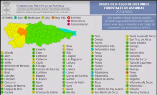 Serán los municipios del occidente asturianos los que presenten riesgo 'alto' de incendios, según esta escala. Mientras los concejos de la zona central permanecerán en riesgo 'moderado'.