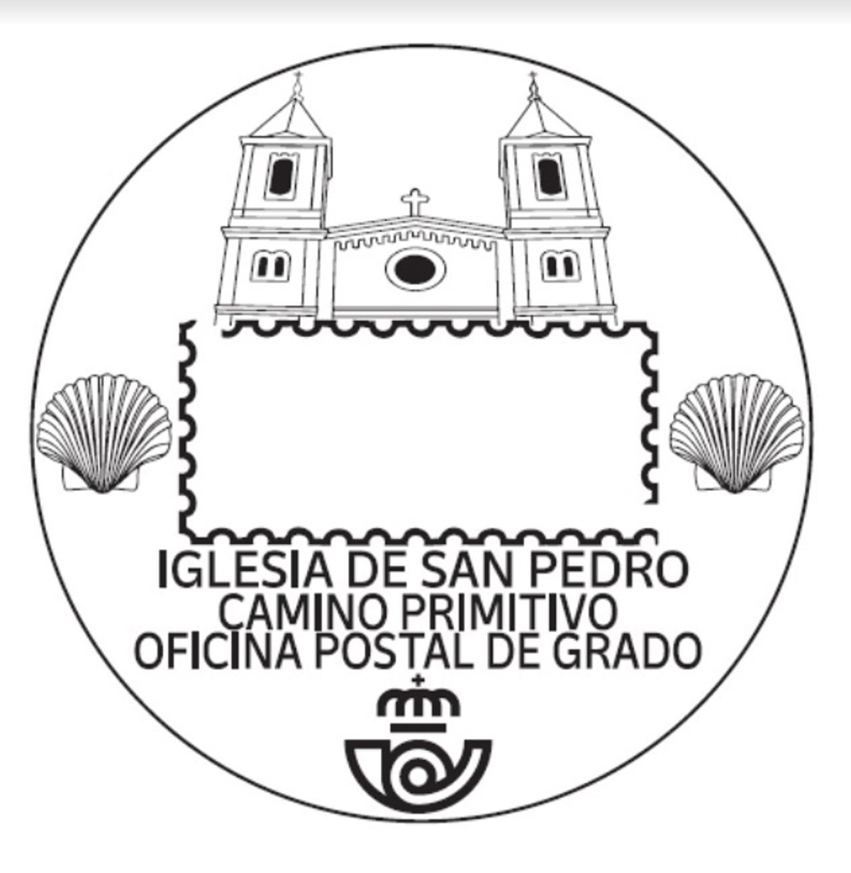El nuevo matasellos de la oficina de Correos de Grado, situada en la calle Eulogio Díaz Miranda, número 21, está protagonizado por la Iglesia de San Pedro, y las conchas de vieira enmarcando el hueco para la fecha.