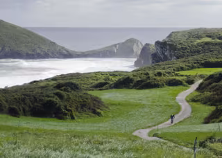 peregrino recorre en bicicleta un tramo de la Ruta a su paso por Celorio.