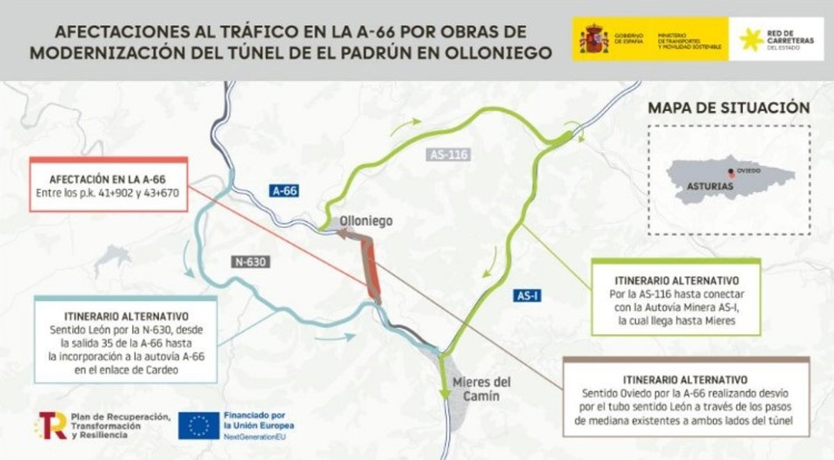 En concreto está previsto el corte de la calzada en sentido León las noches del lunes 6 al martes 7 de abril, y del jueves 9 al viernes 10 de abril entre las 22.00 y las 7.00 horas. Para garantizar la fluidez del tráfico, se habilitará un itinerario alternativo debidamente señalizado por la N-630, desde la salida 35 de la A-66 hasta la reincorporación a la A-66 en el enlace de Cardeo. Asimismo, se establecerá otro itinerario alternativo para circular desde Olloniego hacia Mieres, por la carretera AS-116 hasta conectar con la Autovía Minera AS-I.