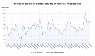 La creación de nuevas empresas en Asturias subió un 27,1% en mayo en tasa interanual con un total 136 sociedades mercantiles constituidas, en un mes en el que las empresas disueltas fueron 35, un 150% más, según los datos difundidos este martes por el Instituto Nacional de Estadística (INE). Se trata del segundo mejor dato de constitución de empresas en un mes de mayo en la región de la serie histórica.