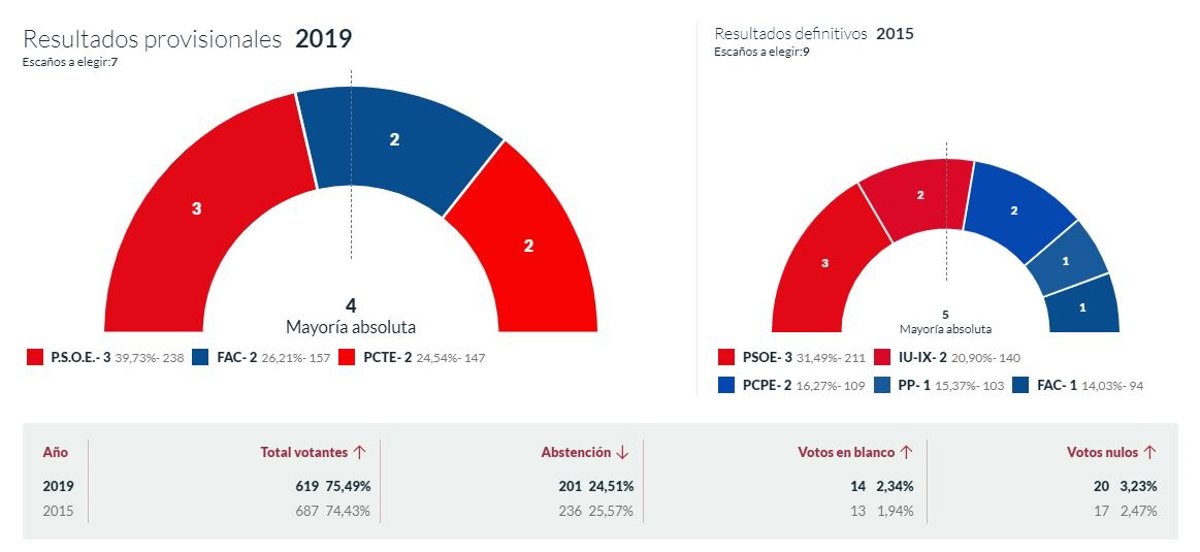 En 2015, el PSOE ganó las elecciones con 3 concejales y el 31,49% de los votos, mientras que IU obtuvo entonces dos ediles y el 20,90% de los apoyos, el PCPE 2 y el 16,27%, el PP logró un concejal y el 15,37% de los votos y Foro Asturias logró el 14,03% y un concejal.