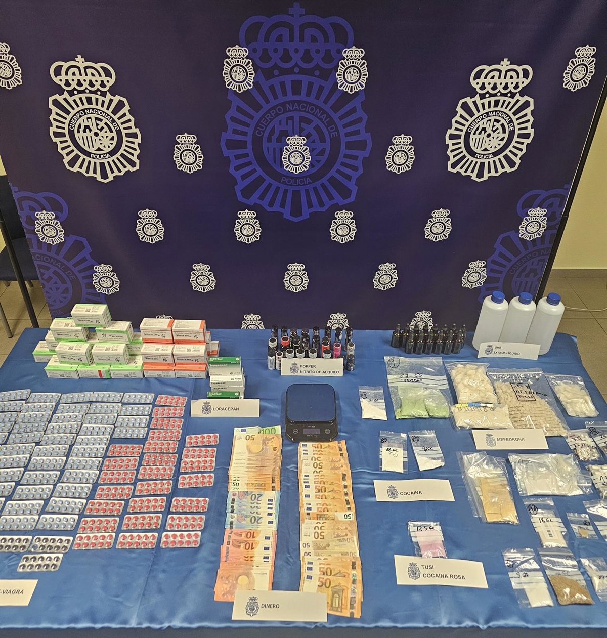 Durante el registro efectuado, se intervinieron 1.366 gramos de mefedrona(MDMA), 66 gramos de cocaína rosa, 24 frascos de popper, 3,1 litros de éxtasis líquido (GHB), 3.350 pastillas de viagra y cerca de 4.000 euros en efectivo.