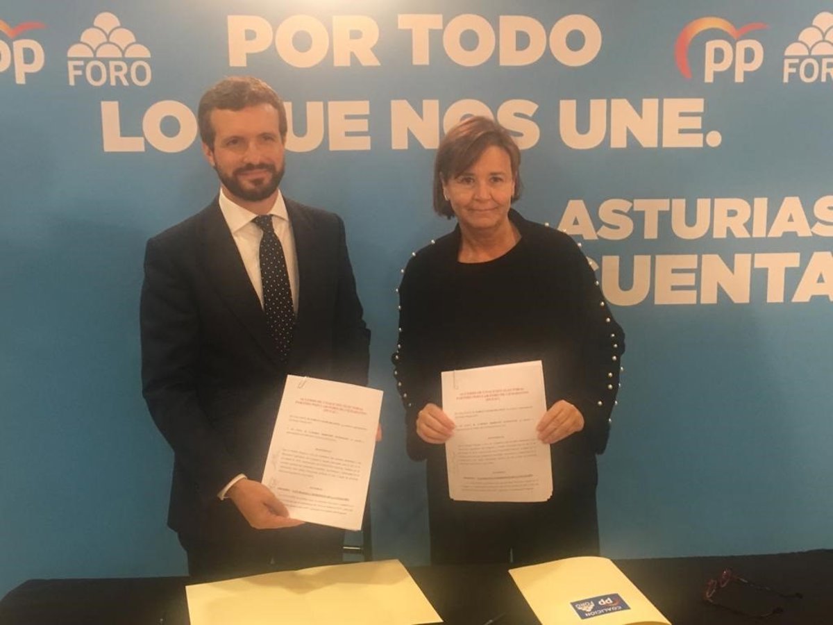 Archivo - El presidente del PP, Pablo Casado, y la presidenta de Foro, Carmen Moriyón, reeditan el acuerdo de coalición para las elecciones generales - EUROPA PRESS - Archivo
