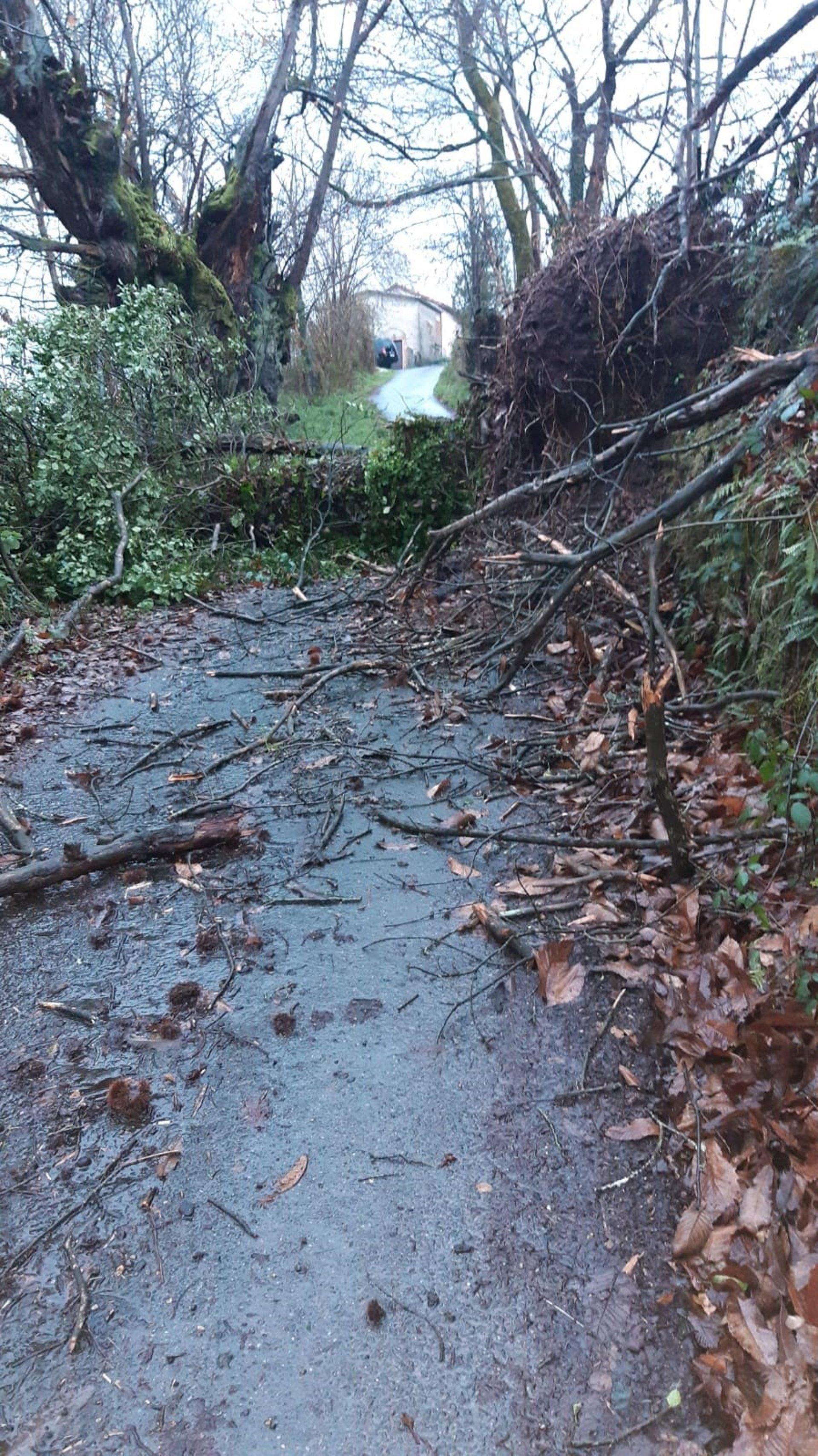 Una de las intervenciones se ha realizado ante el corte de la carretera de local que da acceso al núcleo de Llantamartín, en la parroquia de La Venta, por la caída de un árbol. El aviso de los vecinos se recibió este domingo alrededor de las 23.00 horas y los trabajadores municipales acudieron a primera hora de la mañana del lunes para retirar el obstáculo y dejar libre la vía, que es la única disponible para entrar y salir en el pueblo.