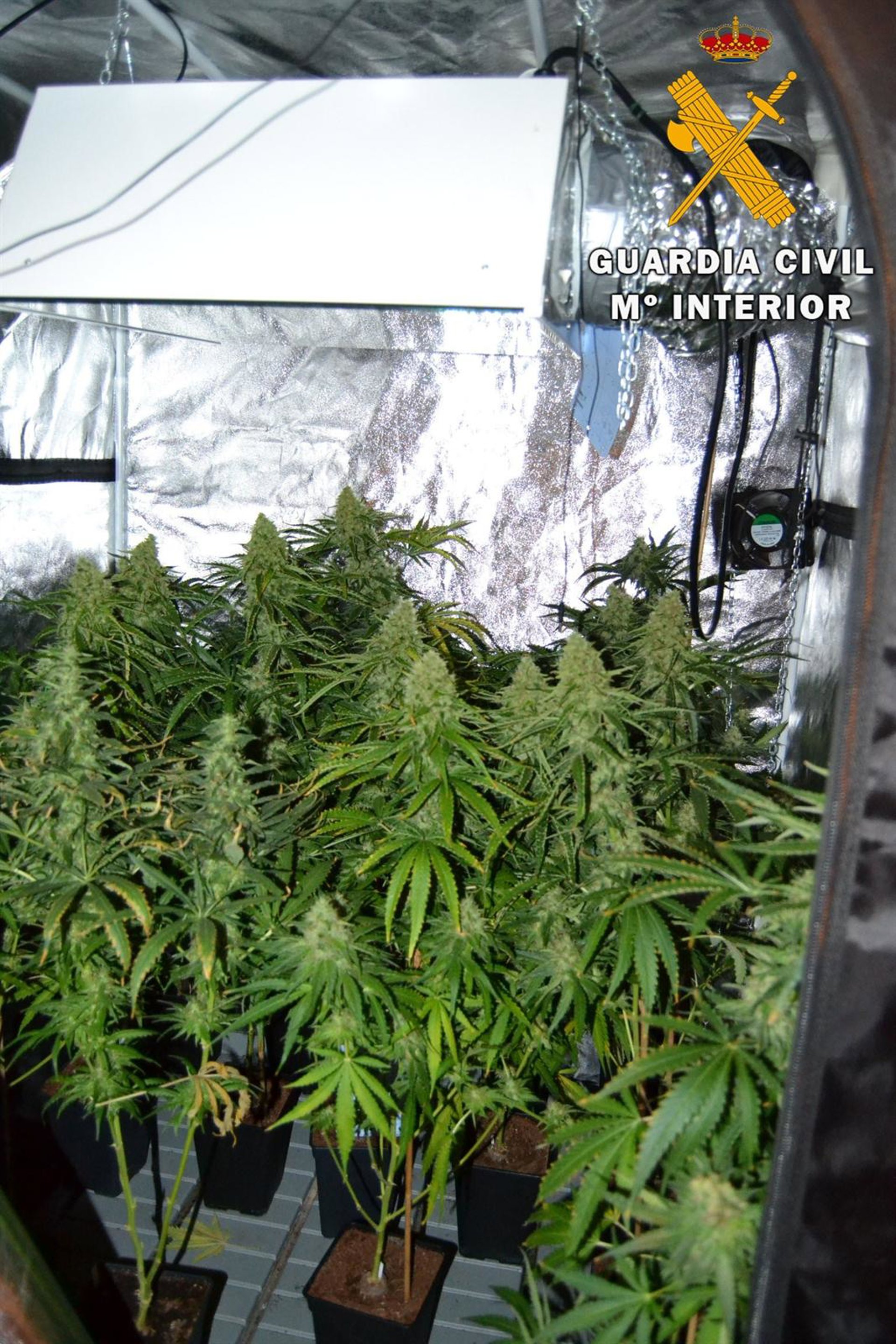 Los agentes comprobaron el interior de la casa de aperos, encontrando en su interior infraganti a una tercera persona picando marihuana. La construcción estaba destinada a secadero y cultivo de Cannabis Sativa, localizándose 86 plantas de marihuana en pequeños maceteros para ser trasplantadas, y diferentes utensilios para el crecimiento de las plantas. También se incautaron 300 gramos de marihuana ya picada y otros útiles.