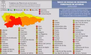 Así mismo el riesgo de incendio forestal será 'muy alto' en otros 31 municipios de la región mientras que el resto de concejos tendrá riesgo 'alto'.
