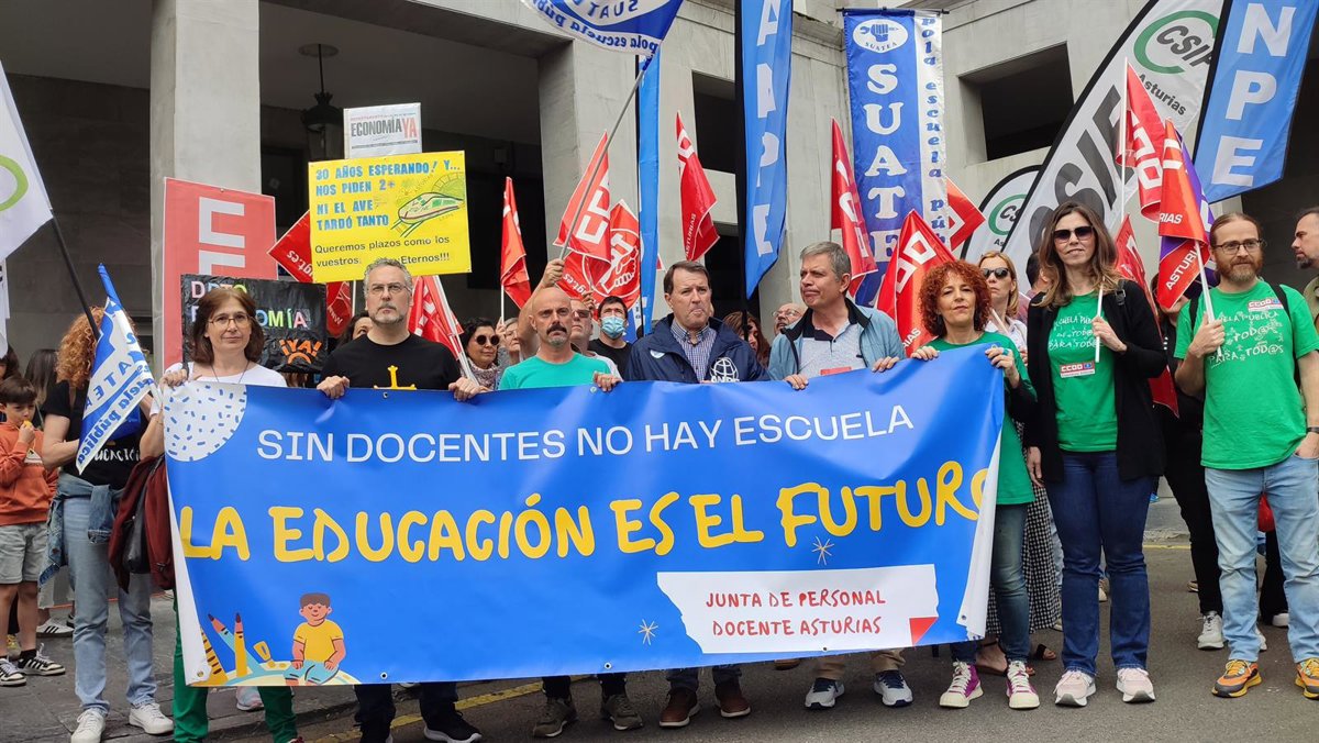 Tras la concentración, los docentes se han desplazado hasta las inmediaciones de la Junta General del Principado de Asturias, donde prosiguen con su protesta.