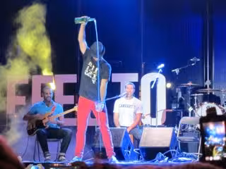 El vocalista Iván, escondido tras su habitual gorro y con una camiseta de la marca Kukuxumusu que ilustraba los 'Efectos de la sidra' haciendo un guiño a su propia banda, salió al escenario junto con sus compañeros Javi (batería), Nau (guitarra) y Arturo (bajo). Los cuatro llegaron a la ciudad portuaria haciéndole relevo a artistas como Julieta Venegas o Auryn, que también habían sido invitados en días anteriores a estos festejos del verano gijonés.