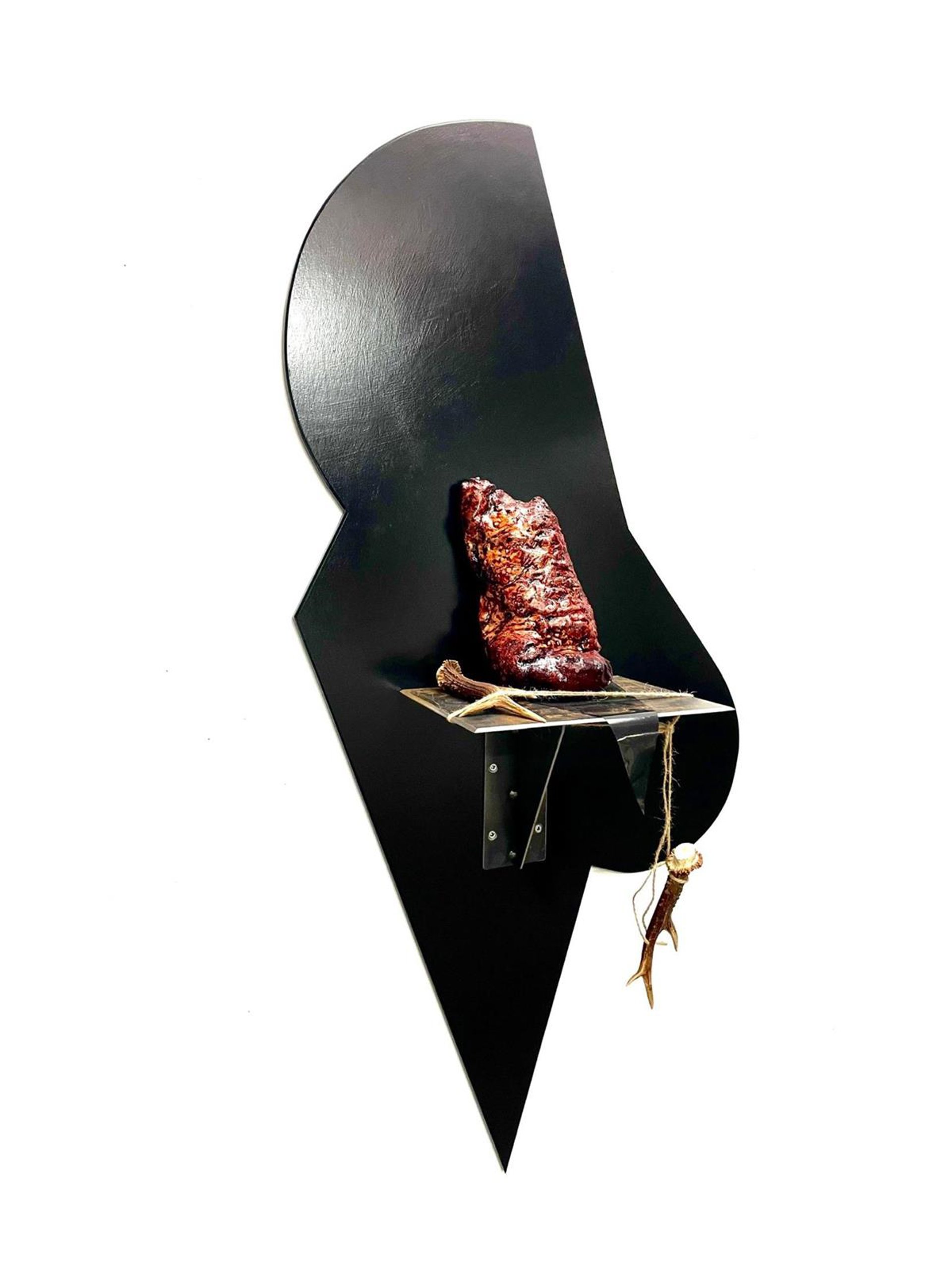 Las piezas, elaboradas con materiales como acero, madera, escayola, resina, poliuretano, telas o incluso mantequilla y sangre animal, combinan superficies pulidas con texturas orgánicas. De este modo, evocan lo corporal sin representarlo de forma literal, apelando a su dimensión más ambigua.