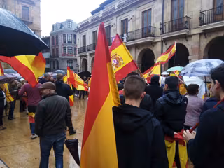 La manifestación convocada en Oviedo por la Fundación para la Defensa de la Nación Española (Denaes) ha congregado en la plaza frente al edificio del ayuntamiento a cientos de personas con banderas españolas que han coreado consignas como "España, unida, jamás será vencida".